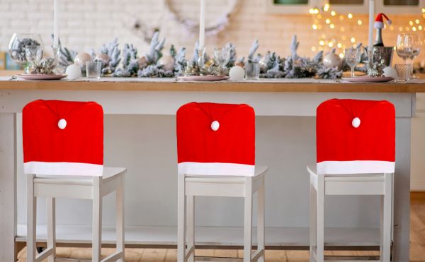 Vánoční potahy na židle SANTASEAT jsou navrženy jako potahy připomínající čepice Santa Clause,