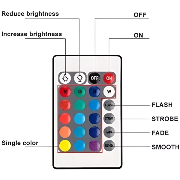AQUASHEIN se dodává s pohodlným dálkovým ovládáním, které vám umožní snadné nastavení osvětlení. Pomocí 24 tlačítek si můžete vybrat ze 16 barev RGB a čtyř dynamických režimů (záblesk, stroboskop, blednutí, plynulé). Světla můžete ovládat ze vzdálenosti až 10 metrů, což zajistí bezproblémové přizpůsobení.