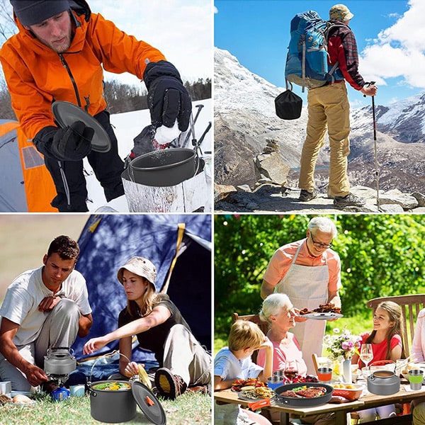 Vařte kdekoli s touto univerzální, kompaktní a lehkou sadou nádobí, ideální pro domov, cestování a venkovní dobrodružství.