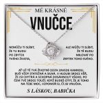 Exkluzivní karta se vzkazem: MÉ KRÁSNÉ VNUČCE, NEMŮŽU TI SLÍBIT, ŽE TU BUDU PO ZBYTEK TVÉHO ŽIVOTA, ALE MŮŽU TI SLÍBIT, ŽE TĚ BUDU MILOVAT PO ZBYTEK TOHO SVÉHO. AŤ UŽ TĚ TVÁ ŽIVOTNÍ CESTA ZAVEDE KAMKOLI, BUĎ VŽDY STATEČNÁ A SILNÁ. V HLOUBI SRDCE VĚŘ, ŽE JSI CHYTRÁ A SCHOPNÁ DOSÁHNOUT VŠEHO, PO ČEM TVÉ SRDCE TOUŽÍ. KDYŽ BUDEŠ CÍTIT, ŽE JE TOHO NA TEBE MOC, VZPOMEŇ SI, ČÍ JSI VNUČKA.
