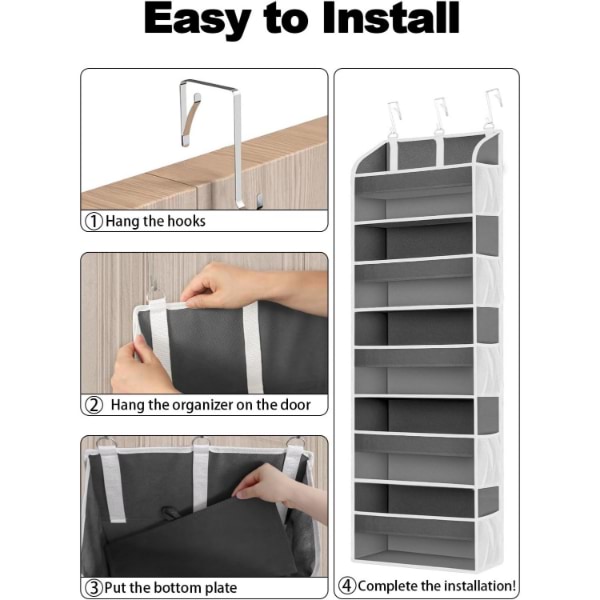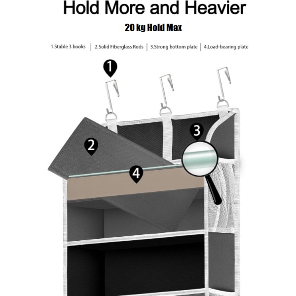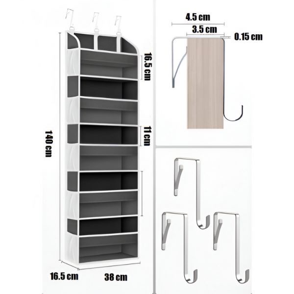 Vybaven organizérem se 3 nastavitelnými kovovými háčky, který snadno pasuje na dveře o tloušťce až 4 cm.