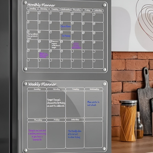 Akrylový set kalendářů na lednici – Měsíční + týdenní plánovač (každý 40 x 30 cm), 4 magnety, stíratelný za sucha, fixy součástí balení | REUSABLEPLAN