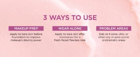 - PODKLADOVÁ BÁZE POD MAKE-UP NA OBLIČEJ A POD OČI: Aplikujte na vyčištěnou pleť nebo po úplném vstřebání hydratačního krému. Rozetřete pod oči a vyhlaďte jemné vrásky, na nos a tváře, abyste minimalizovali výskyt pórů a skvrn, a do t-zóny pro matný výsledek