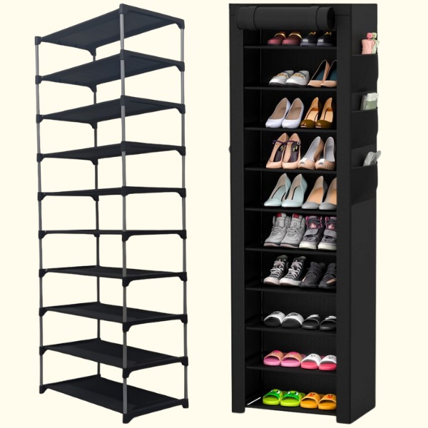 Přenosný a skládací botník OMARA má 10 nastavitelných polic. Umožňuje uložit až 20 párů bot, udržuje vaši sbírku přehlednou a snadno přístupnou.